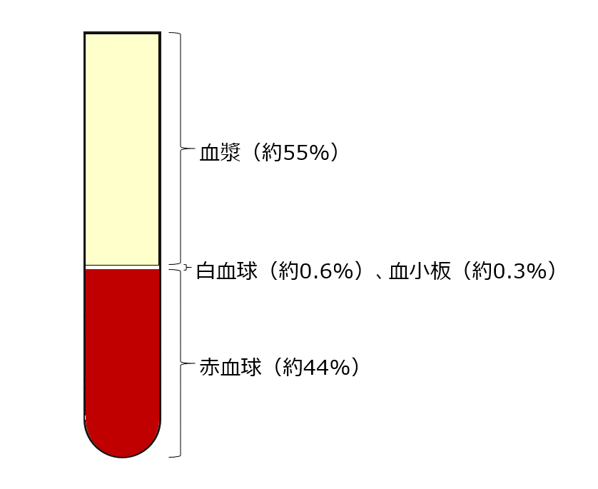 一番上は、透明〜淡黄色の液体「血漿」で、血液の約55%を占めます。