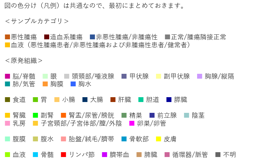 ・カラーバー: サンプルカテゴリと原発組織の色分けは、以下の通りです。