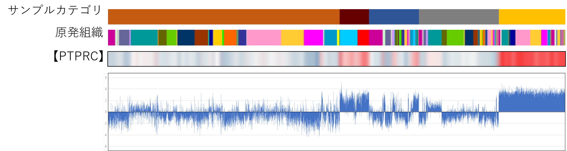 図は上から順に、カラーバー(サンプルカテゴリと原発組織)、ヒートマップ、グラフの構成になっています。