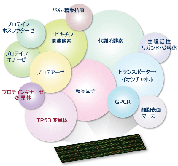 福島ヒトタンパク質コレクションを搭載した福島事業独自のタンパク質マイクロアレイです。様々な研究への応用が可能です。