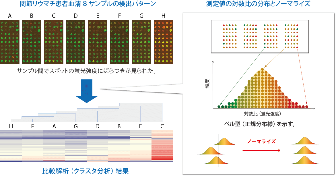 独自手法のノーマライズを施したデータを比較解析に用いることで、個々人に特徴的な自己抗体や患者間で共通の自己抗体を再現性よく検出できます。