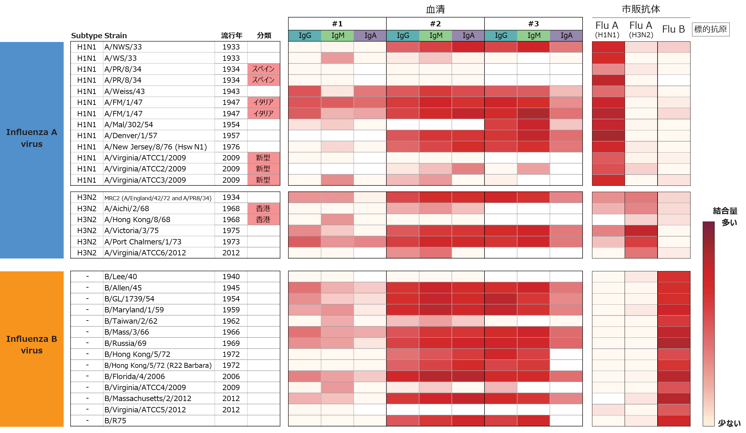 血液中の抗インフルエンザウイルス抗体の有無、市販抗体の結合性を評価